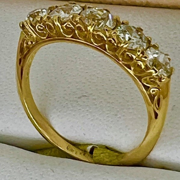 1 18ct yellow gold 5 stone diamond bridge ring. Set with 5 old cut diamonds TCW 1,30ct.
