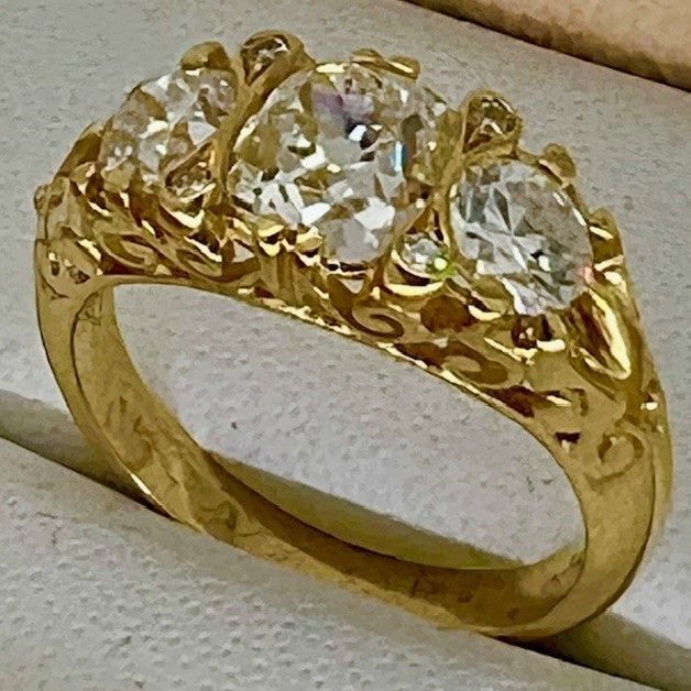 18ct yellow gold handcrafted 3 stone diamond half hoop ring. Set with old cut diamonds TCW 2,53ct.